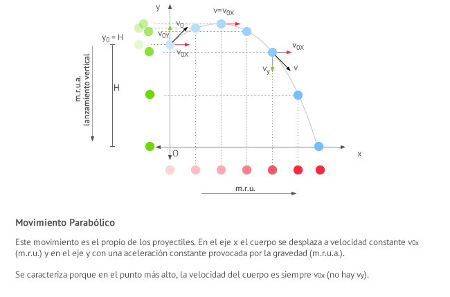 movimientos en dos dimensiones: un m.r.u. en el eje horizontal y un m.r.u.a. en el eje vertical.