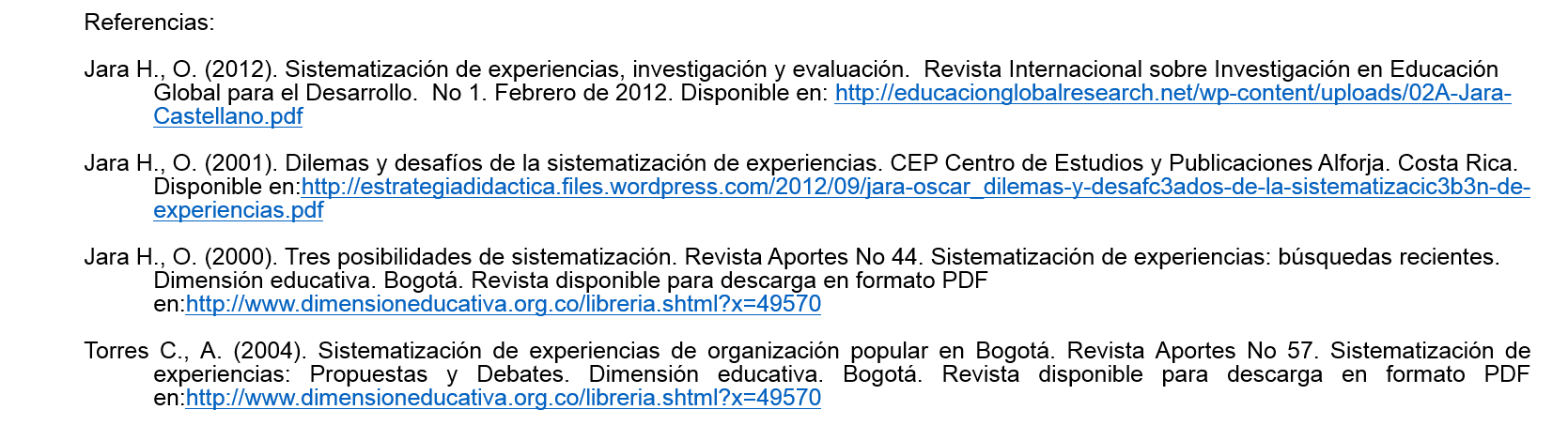 Tomado del documento:Tres posibilidades de sistematización de experiencias Pg. 12 - 14.