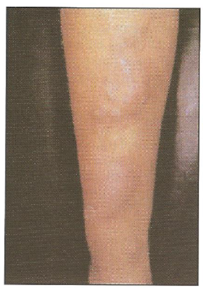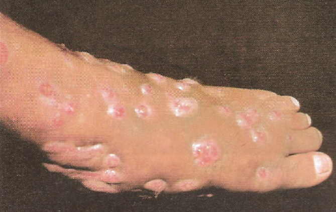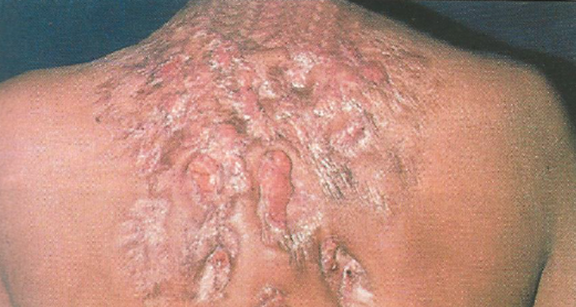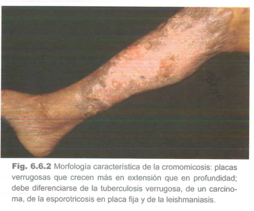 rojo violáceo, bordes definidos. Dx dif: TB verrugosa, cromomicosis, nevo verrugoso.