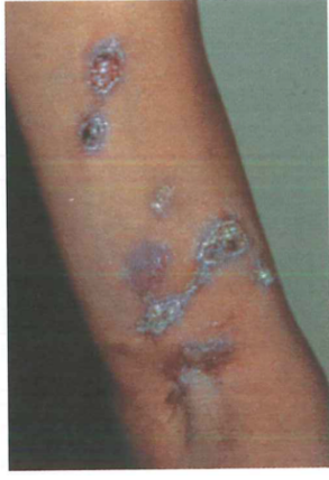 trayecto de los vasos linfáticos se ulceran y cubren costra, pueden confluir y cicatrizar.