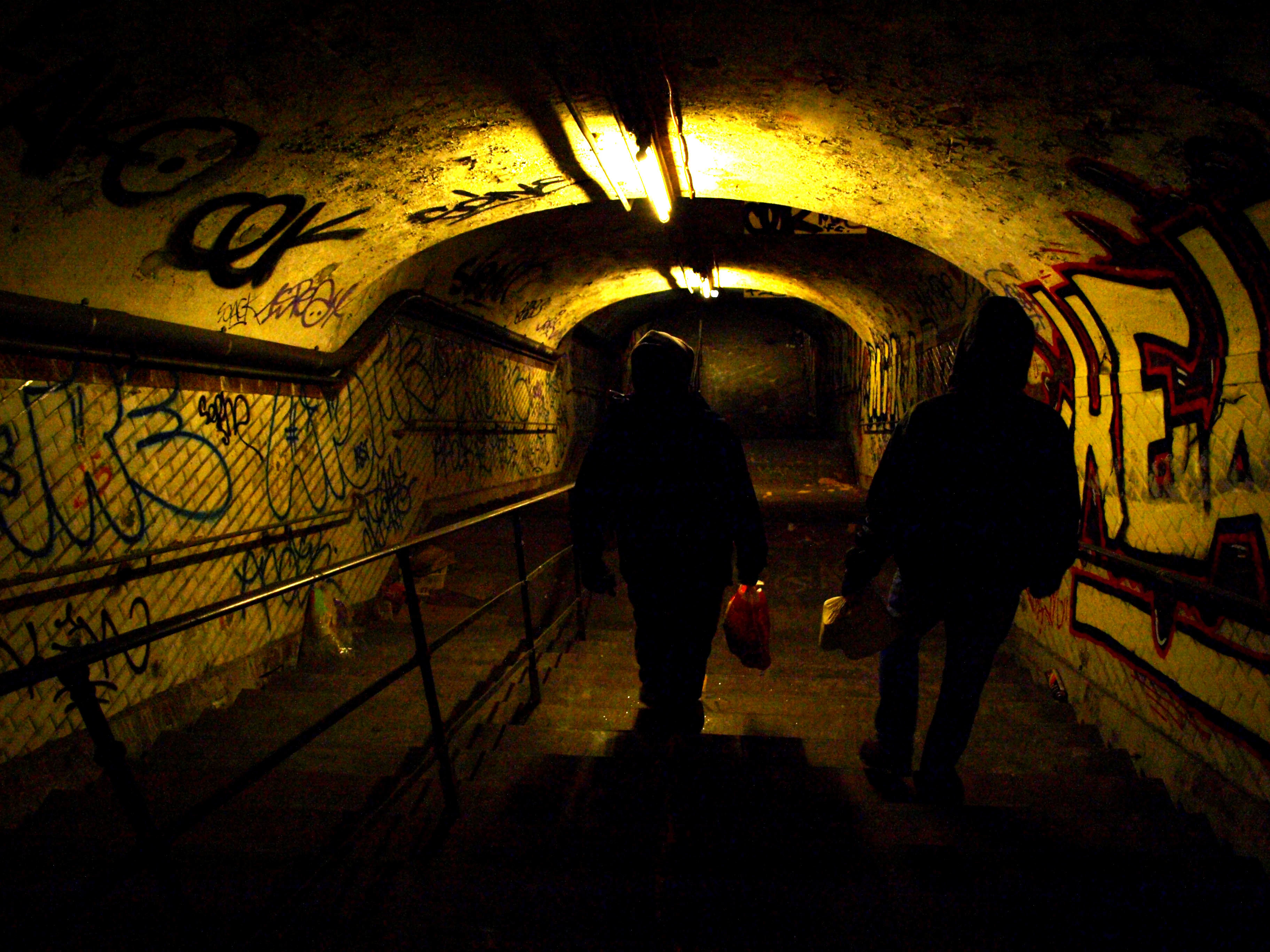 PAREJA SALIENDO DE UNA ALCANTARILLA