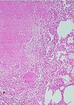 celulas lisadas y un resto granular amorfo rodeados de un margen inflamatorio