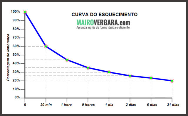 entendeu o gráfico, resumindo em poucas palavras, quanto mais tempo se passa a partir do momento que você aprendeu algo, mais chances você tem de esquecer aquilo. A melhor maneira de evitar que isso aconteça é revisando ou “treinando” o que você aprendeu, sempre com intervalos de alguns dias entre uma revisão e outra.