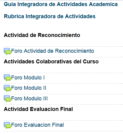 general de actividades y la rubrica de evaluacion general, los foros para cada una de las actividades