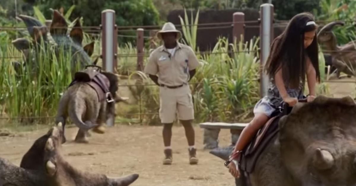 en la película se muestran dinosaurios bebes en un área para pequeños donde puedes montarlos y posteriormente puedes verlos grandes