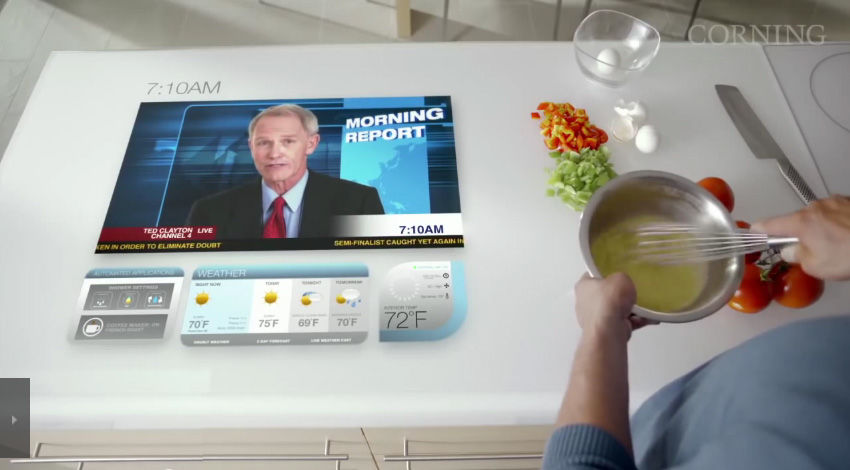 CORNING = Empresa que hizo este vídeo. Fabrica Vidrio y cerámica. Hizo este comercial con la intención de enseñarle a la gente que se puede pensar en un mundo con tecnología y energía renovable; pensando en un futuro cercano.