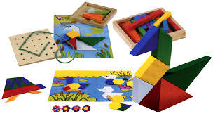 rompecabezas, tangram, móviles, plastilina, tabletas de madera, figuras, etc.