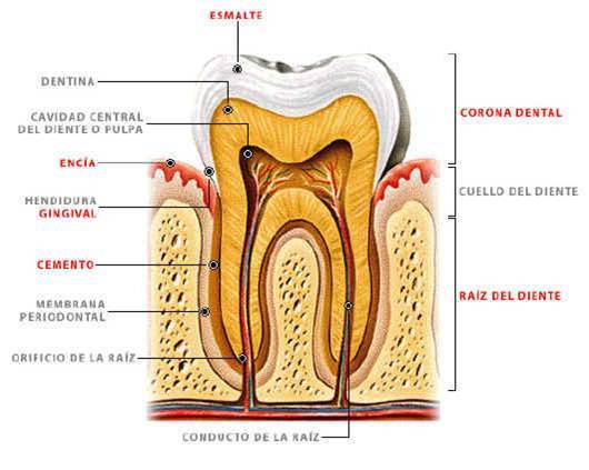 El diente es un órgano enclavado en los alvéolos de los huesos maxilares. Su estructura está