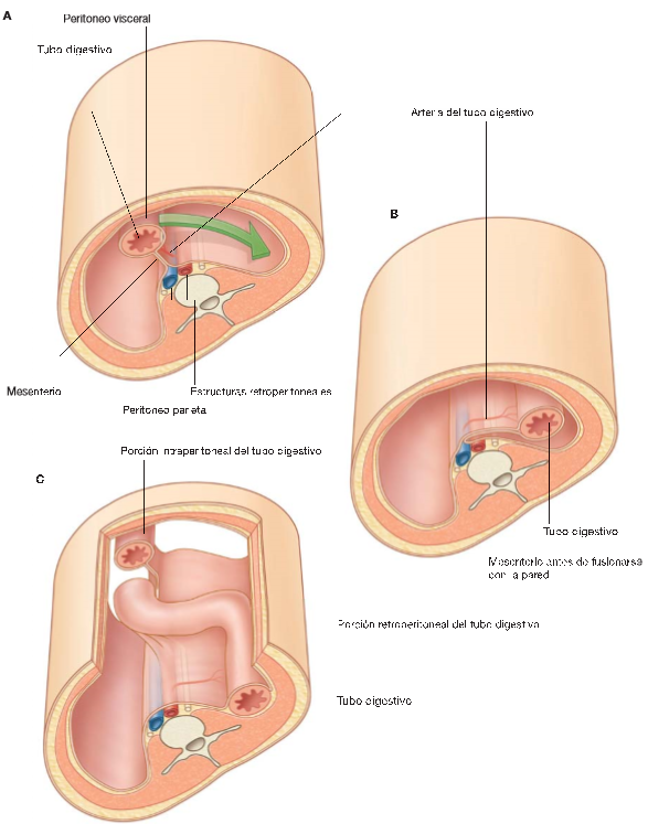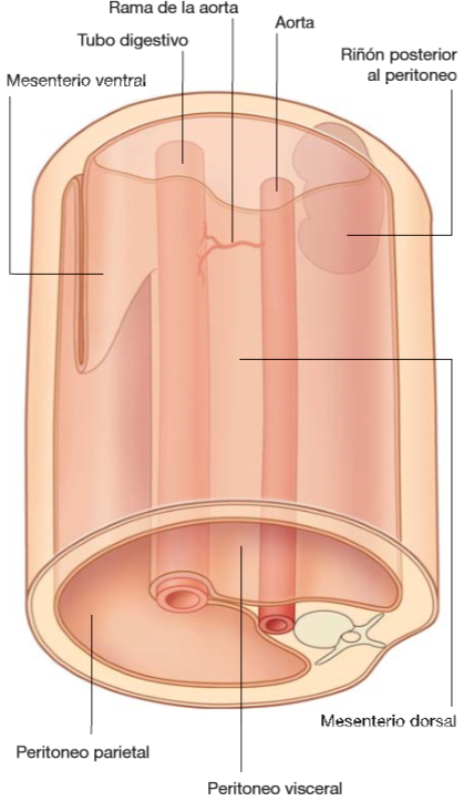 tubo intestinal suspendido de pared abdominal posterior y parte de la anterior