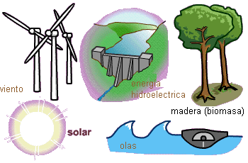 -Biomasa: bosques, madera, restos de residuos de cultivo, etc. - Agua - Energía hidráulica (puede ser hidroeléctrica). -