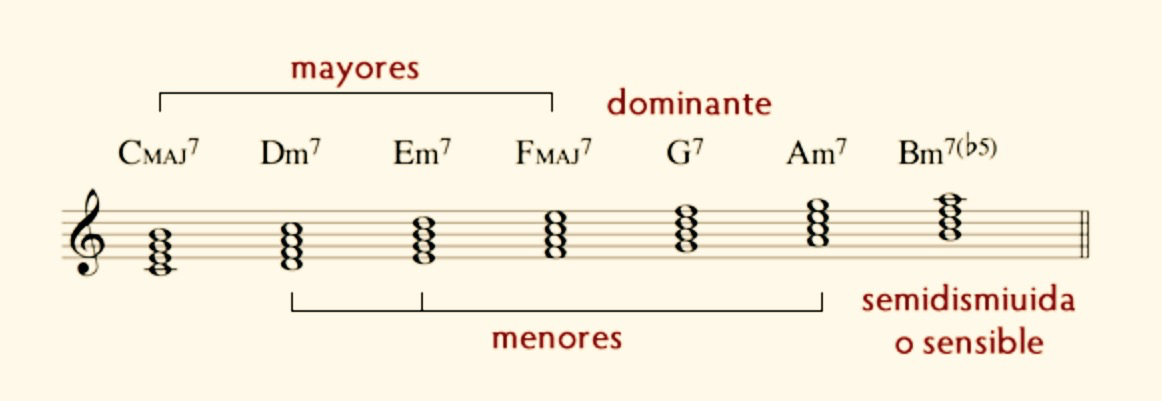 Formado por un acorde de triada Mayor (3ª M y 5ª J) con una 7ª Mayor a pàrtir de una nota dada