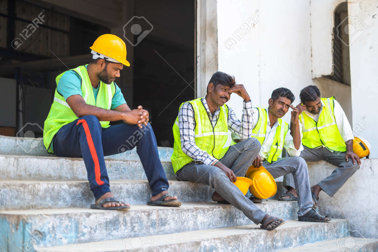 183891237 Trabajadores Industriales Preocupados Sentados Fuera De La Fábrica Debido Al Cierre Concepto De (image/jpeg)