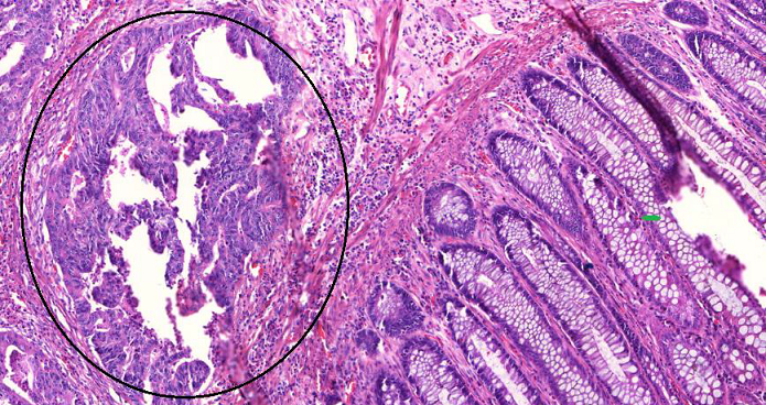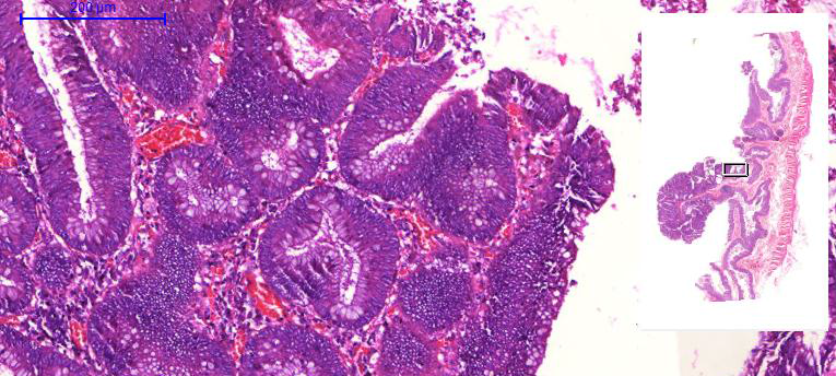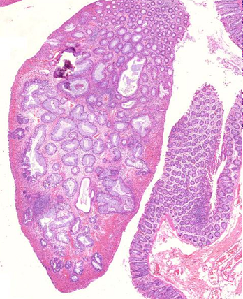Neoplasias: pólipo juvenil, adenocarcinoma tubular, pólipo adenomatoso viloso de baixo grau