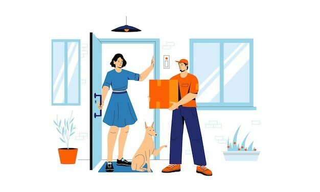 Entrega Puerta Repartidor Dibujos Animados Da Pedido Cliente Al Cartero Mensajeria Dibujos Animados Cliente Paquete Cerca Concepto Logistica Alimentos Puerta Ilustracion Vectorial 102902 7274 (image/jpeg)