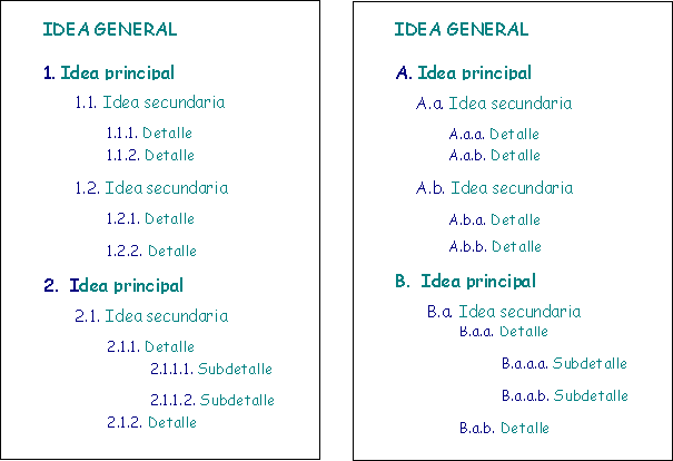 5. Empleo de colores, subrayado y distintos tipos y tamaños de letra, estableciendo niveles de jerarquía (subordinación) según la importancia de cada concepto. Además del color y la letra (mayúsculas, minúsculas, negrita, cursiva) es esencial realizar sangrías de mayor o menor entidad.