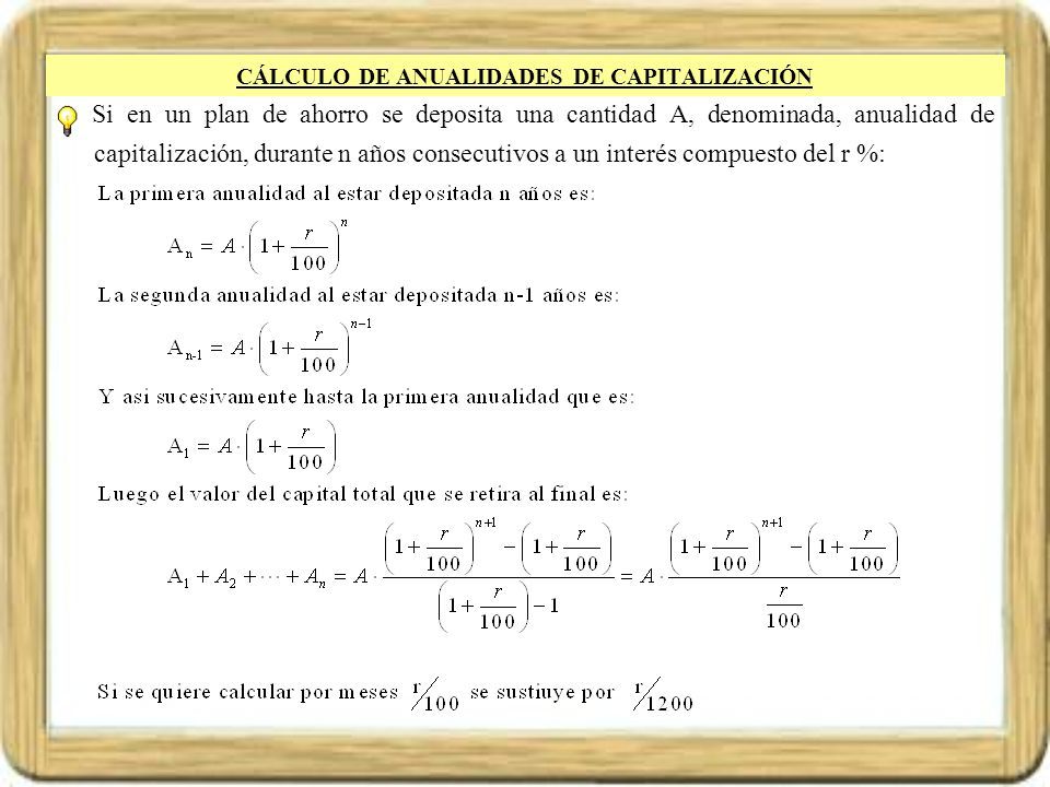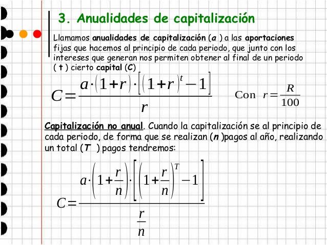 No anuales: a=[D(1+r/n)^t*n *r/n]/(1+r/n)^t*n-a