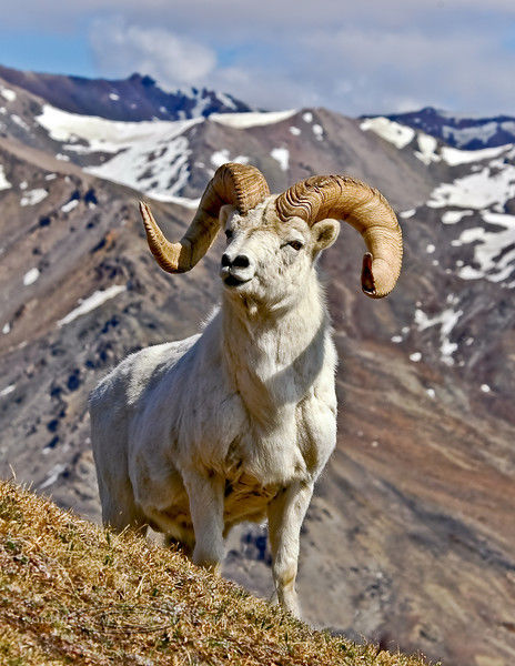 arriba, y se curvan fuertemente hacia atrás como un par de ganchos. El color del pelaje varía según