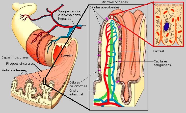 Consiste que contiene el quilo se produce a través de los pliegues de las paredes del intestino delgado,llamado vellosidades intestinales.Los nutrientes del quilo pasa a la sangre para ser repartidos a las células.