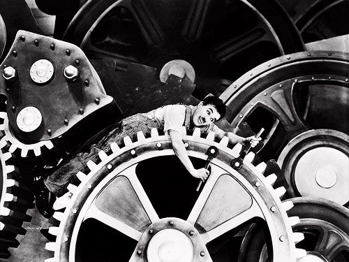 "Tempos Modernos" segue a vida de um funcionário, um trabalhador modelo que, apanhado nas rotinas da produção em massa, tem um esgotamento nervoso. Do hospital, à prisão, ao desemprego, ao "Vagabundo" tudo acontece. Até que o amor de uma bela mulher o ajuda a escapar da polícia.