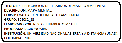 Mapa Mental sobre la diferenciación de términos del curso Evaluación de Impacto Ambiental. Autor: Néstor Humberto Mateus Pulido. Programa: Agronomía. Grupo: 358032_33 Periodo 16-01 (2016)