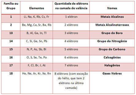 Grupos de elementos com propriedades químicas semelhantes e com o mesmo número de elétrons na camada de valência.