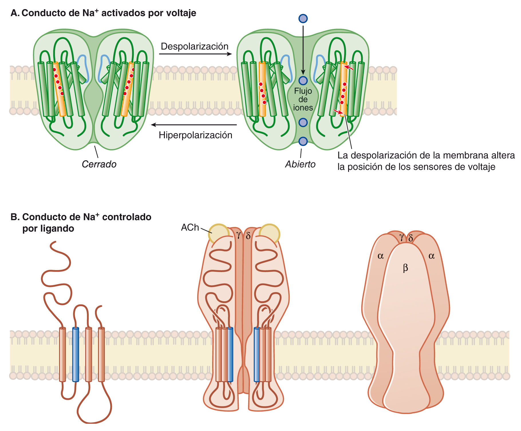 transportadores iónicos para Na+, K+, Ca2+ y Cl-.