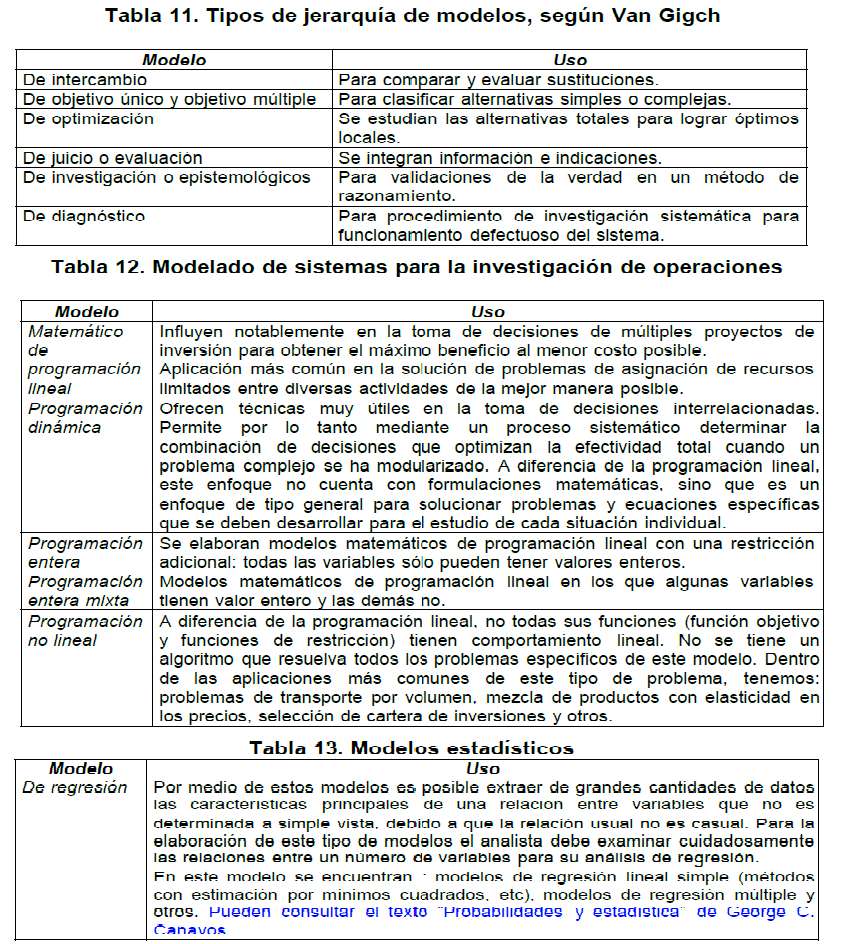 Van Gigch identifica diversos tipos de modelos para múltiples usos trabajo. Los modelos identificados son del siguiente tipo de jerarquía: y áreas de