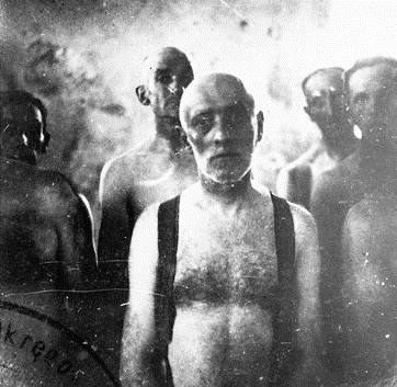 En la imagen de arriba un hombre Judío está previo a entrar a la cámara de gas.