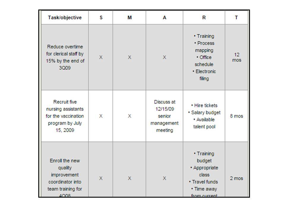 Specific (Específico),Measurable(Medible),Achievable(Factible),Realistic(Realista),Time-related(Específicado en el tiempo.