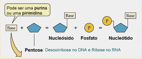 Cada nucleótido é constituído por 1 base azotada, 1 pentose e 1 grupo fosfato (ácido fosfórico)