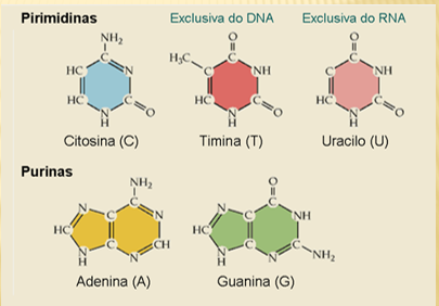 Nota: timina - só presente no DNA; uracilo - só presente no RNA