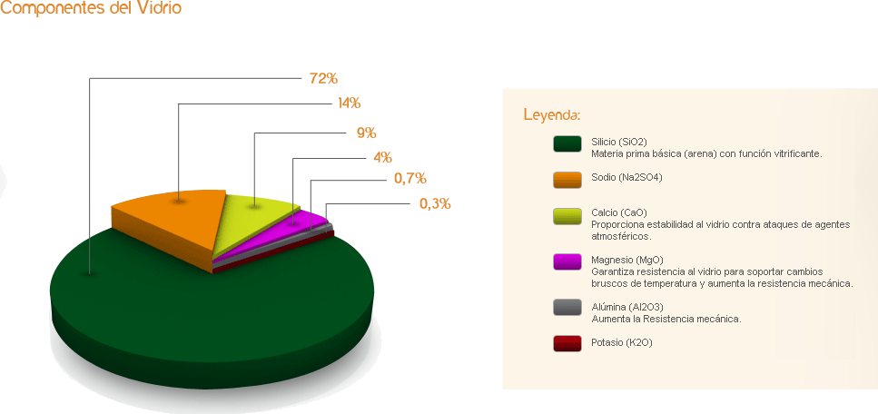 El vidrio se fabrica a partir de una mezcla compleja de compuestos vitrificantes, como sílice, fundentes, como los álcalis, y estabilizantes, como la cal. Estas materias primas se cargan en el horno de cubeta (de producción continua) por medio de una tolva. El horno se calienta con quemadores de gas o petróleo. La llama debe alcanzar una temperatura suficiente, y para ello el aire de combustión se calienta en unos recuperadores construidos con ladrillos refractarios antes de que llegue a los quemadores. El horno tiene dos recuperadores cuyas funciones cambian cada veinte minutos: uno se calienta por contacto con los gases ardientes mientras el otro proporciona el calor acumulado al aire de combustión. La mezcla se funde (zona de fusión) a unos 1.500 °C.