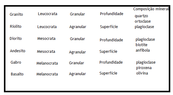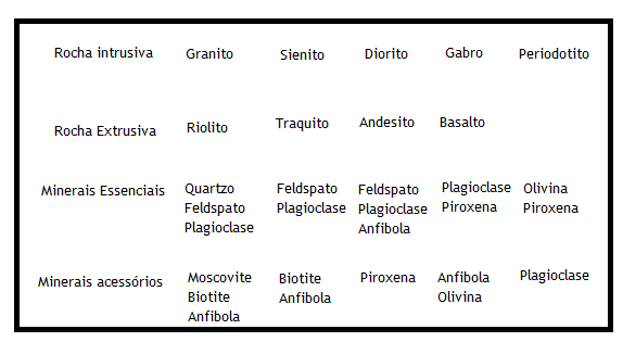 • Rocha ácida - granito (&gt;65%) Intermédia - diorito  básica - basalto (entre 43 e 42) ultrabásica - peridotito (&lt;43%)