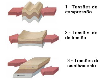 • - limites de tensão com movimentos convergentes (tensão compressiva) - limites com movimentos divergentes (tensão distensiva) - limites com movimentos transformantes (tensão de cisalhamento)