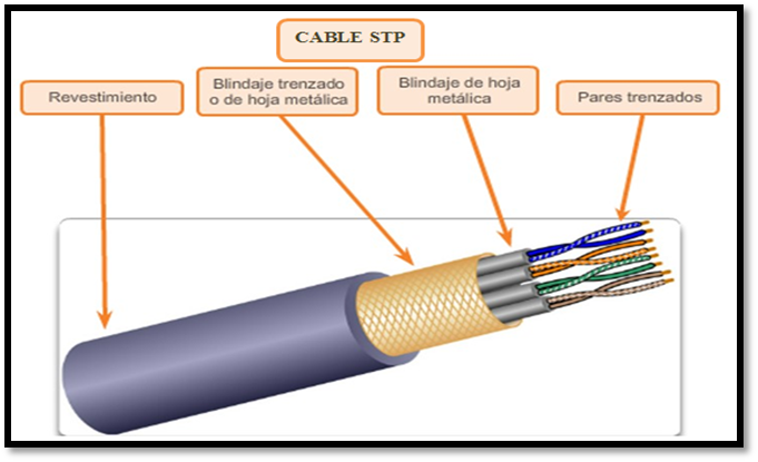 El cable STP utiliza una envoltura con cobre trenzado, más protectora y de mayor calidad que la usada en el cable UTP. STP también utiliza una lámina rodeando cada uno de los pares de hilos. Esto ofrece un excelente apantallamiento en los STP para proteger los datos transmitidos de intermodulaciones exteriores, lo que permite soportar mayores tasas de transmisión que los UTP a distancias mayores.