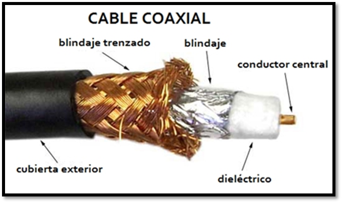 Consta de dos conductores de cobre pero dispuestos de forma concéntrica e lugar de un paralelo, este tipo de cable es común en las conexiones de televisión por cable. El cable coaxial consta de un núcleo de hilo de cobre rodeado por un aislante, un apantallamiento (recubrimiento) de metal trenzado y una cubierta externa. Alcanza velocidades de 1 Mbps o superiores.