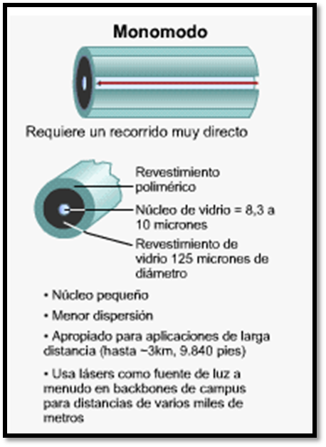 En este tipo de fibra óptica el haz de luz transmitido se propaga por un solo modo o camino. Se logra reduciendo el diámetro del núcleo de la fibra hasta un tamaño (8,3 a 10 micrones) que sólo permite un modo de propagación. Su transmisión es paralela al eje de la fibra. A diferencia de las fibras multimodo, las fibras monomodo permiten alcanzar grandes distancias (hasta 400 km máximo, mediante un láser de alta intensidad) y transmitir elevadas tasas de información (decenas de Gb/s).