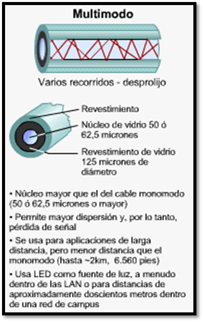 Es aquella en la que los haces de luz pueden circular por más de un modo o camino. Esto supone que no llegan todos a la vez. Una fibra Multimodo puede tener más de mil modos de propagación de luz. Las fibras Multimodo se usan comúnmente en aplicaciones de corta distancia, menores a 1 km y es relativamente económico.