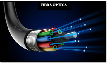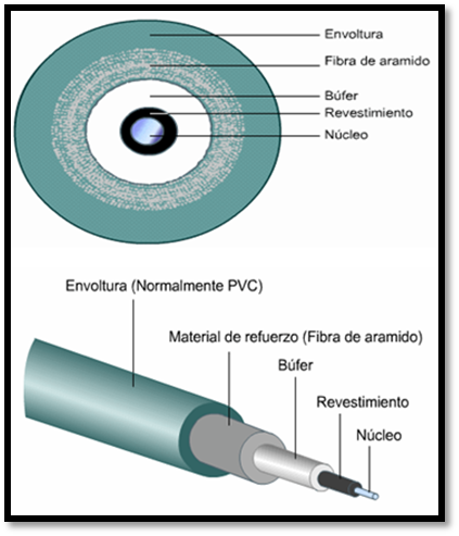 Es un medio guiado flexible y de poco espesor que conduce pulsos de luz, representado cada pulso por un bit (1 o 0). El cable de fibra óptica es apropiado para transmitir datos a gran velocidad, por encima de decenas o incluso centenas de gigabit por segundo. La fibra óptica es inmune a las interferencias electromagnéticas y presenta una atenuación de la señal muy baja hasta una distancia de 100 Kilómetros, es el medio de transmisión guiado más utilizado para conexiones entre largas distancias y enlaces transoceánicos. El cable de fibra óptica está compuesto por un cilindro de vidrio extremadamente delgado, denominado núcleo, recubierto por una capa de vidrio concéntrica, conocida como revestimiento.