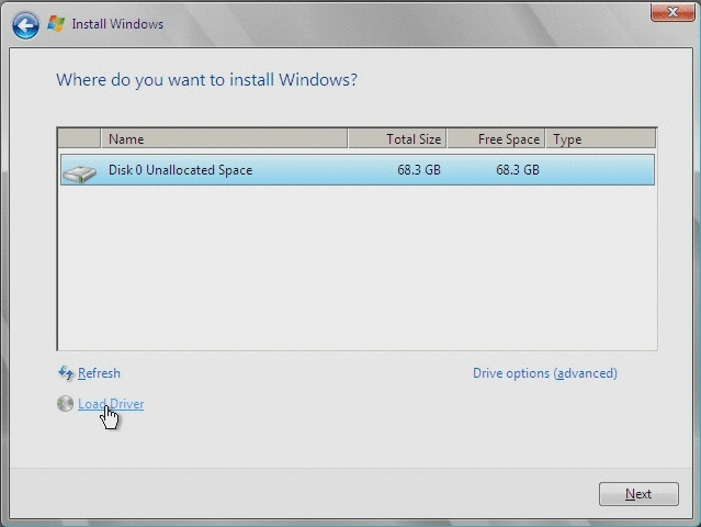 Cuando se le pregunte dónde quiere instalar el sistema operativo Windows, haga clic en la opción