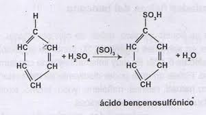 El benceno reacciona con el ácido sulfúrico, generando los ácidos sulfónicos.
