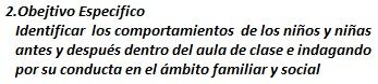 2. Objetivo Especifico: Identificar los comportamientos de los niños y niñas antes y después dentro del aula de clase e indagando por su conducta en el ámbito familiar y social