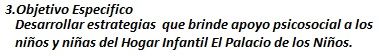 3. Objetivo Especifico: - Desarrollar estrategias que brinde apoyo psicosocial a los niños y niñas del Hogar Infantil El Palacio de los Niños.
