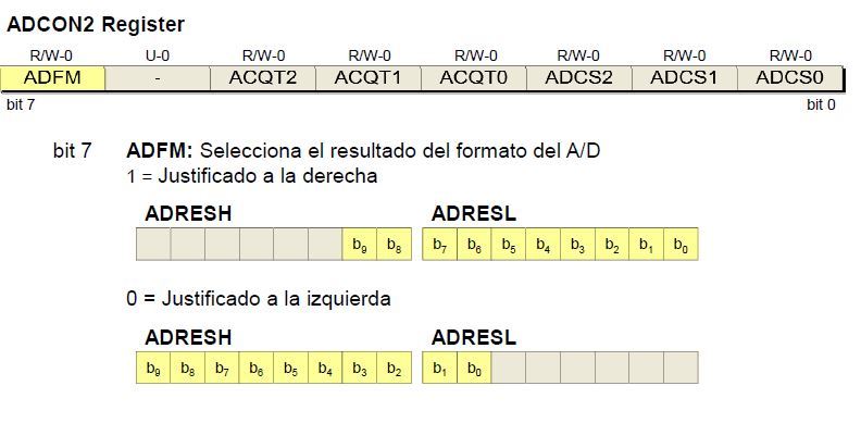 ADCON0). Tiene una resolución de 10 bits y es posible indicarle al PIC voltajes de referencia VREF(-) y VREF(+). Cabe