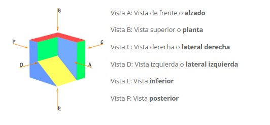 Vista A: Vista de frente o alzado Vista B: Vista superior o planta Vista C: