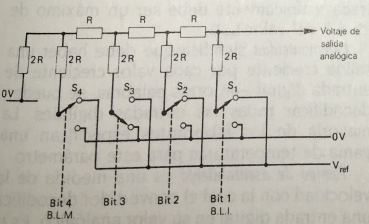 se usa un grupo de transistores que se controlan por medio de la entrada digitalpara conducir corrientes en relación binaria