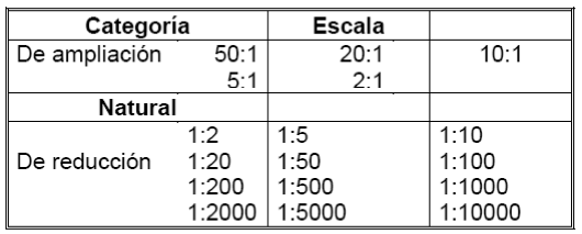 Relacion existente entre la dimension lineal de un elemento de un objeto, tal como se representa en el dibujo y la dimension real del mismo elemento