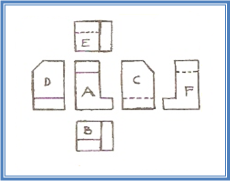 obtienen tres vistas fundamentales, "A", "B" y "C", y tres vistas principales, "D", "E" y "F”. Las flechas