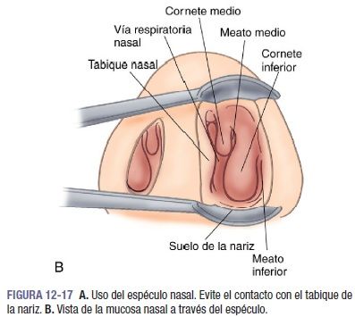 Inspeccione el color de la mucosa nasal y la presencia de secreciones, masas, lesiones e inflamación