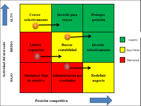 horozontal (X) mide el atractivo del mercado y el eje vertical (Y) la poasición competitiva de las UEN
